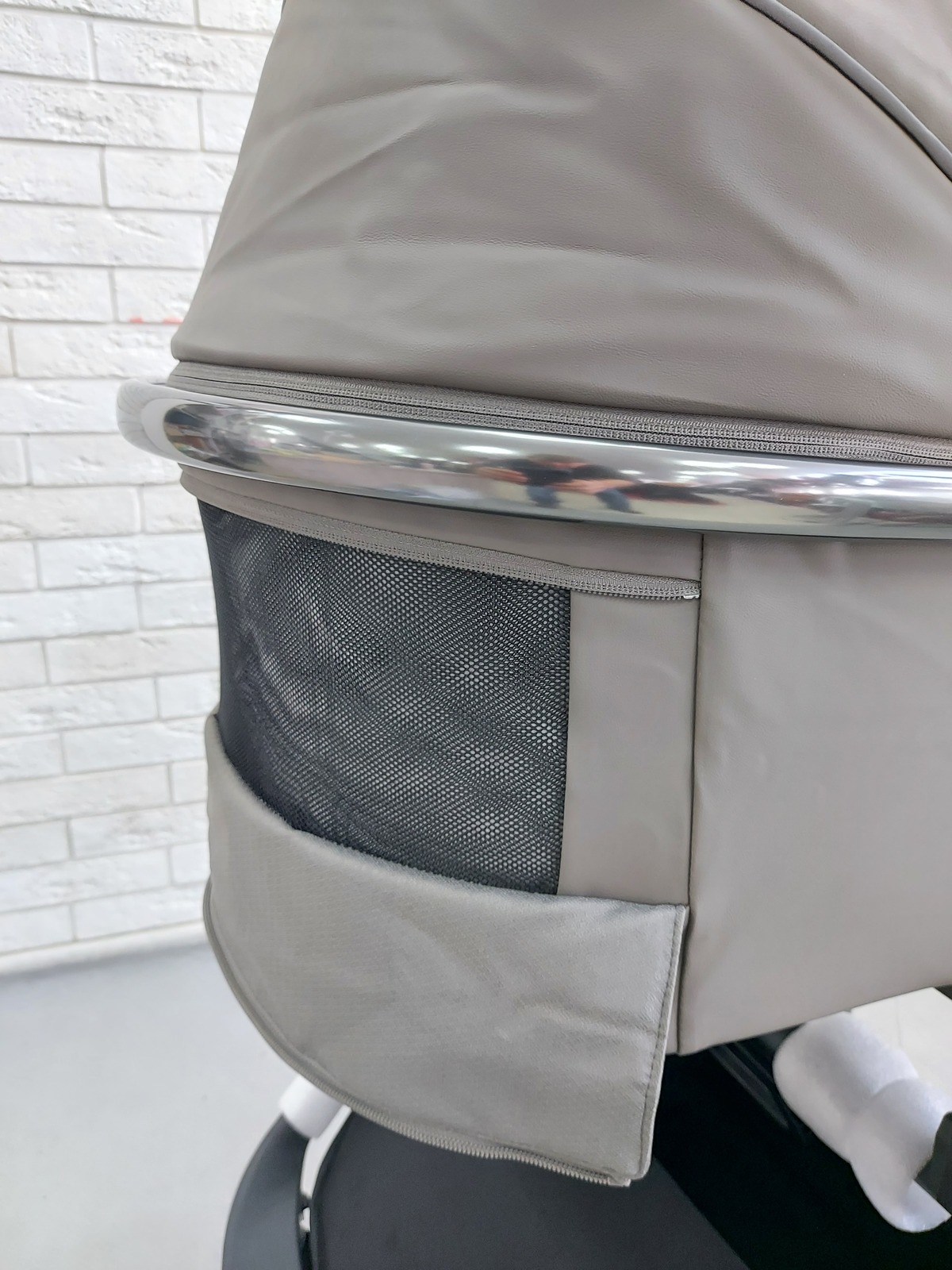 Проходимость, удобство и практичность. Прочная, но лёгкая алюминиевая рама делает коляску манёвренной и простой в управлении. Передние колёса поворачиваются на 360° и при необходимости фиксируются в прямом положении — это особенно удобно на неровных поверхностях. Все колёса оснащены амортизацией, что обеспечивает плавный и тихий ход даже по брусчатке или грунтовой дороге. Ручка регулируется по высоте в пяти положениях и обтянута той же качественной экокожей, что и остальные элементы. На ручке предусмотрено место для небольшой сумочки. Вместительная корзина под сиденьем легко вмещает покупки или необходимые вещи, а складная конструкция позволяет компактно хранить коляску и брать её с собой в поездки.